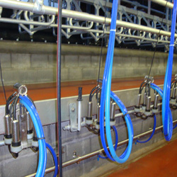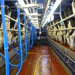 Tijdens het melken zijn alle spoeljetters netjes weggeklap onder de putrand en heeft de melker er geen hinder van.